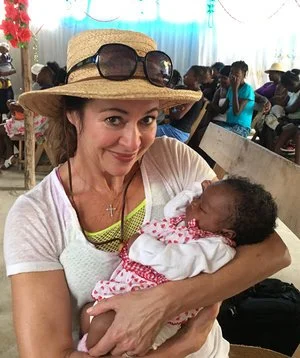 Rachelle screens the toddler and a 4-year-old girl, who is grinning from ear to ear after coming by a 25 gourde bill.